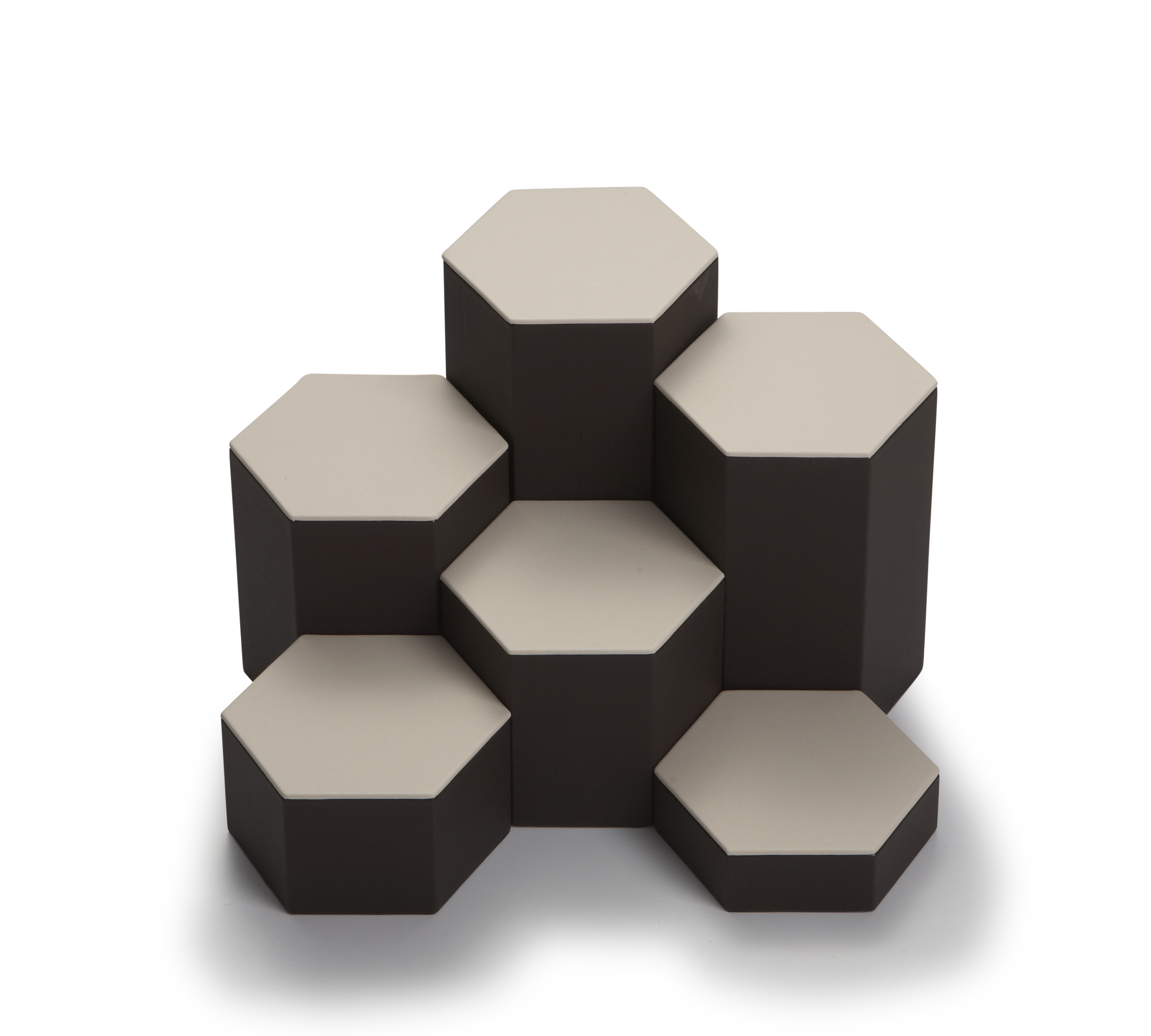 Description: Chocolate/Beige Leatherette 6 PCs Hexagon Risers each one at a different height