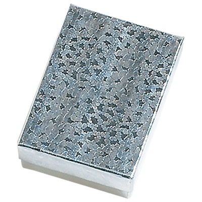 Description: Silver Cotton Filled Boxes. *100 Boxes per Case. These boxes ship with non-tarnishing jeweler's cotton, however, you can click here to purchase velboard pads for this box.